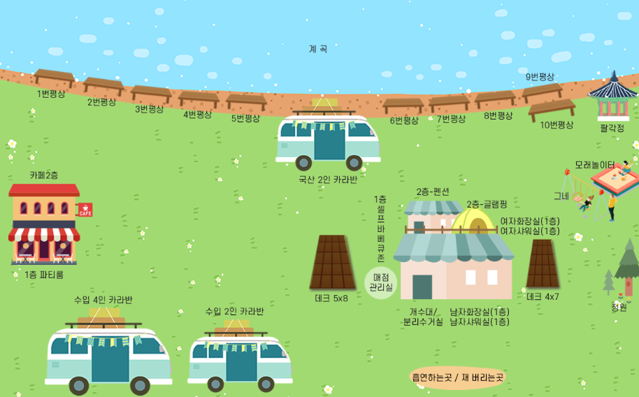 - 커피숍(넓은 규모, 모임 가능), 멀티 자판기, 바비큐존(그릴·숯 대여 가능)