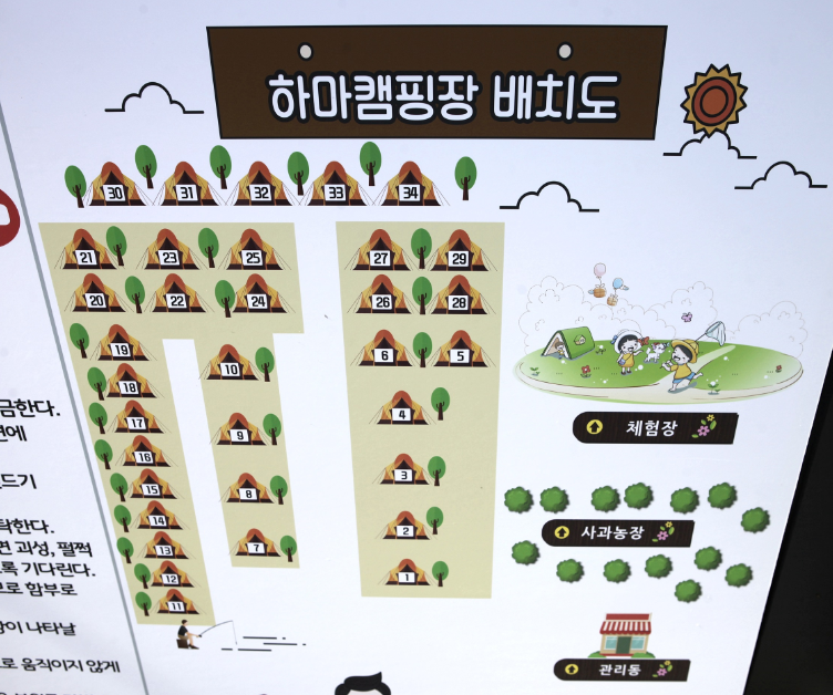 하마캠핑장에 도착하자마자 느껴지는 건 푸른 사과밭과 넓게 펼쳐진 낚시터, 그리고 시골의 정겨운 풍경이었습니다. 캠핑장 규모도 꽤 넓고, 사이트가 40여 개나 되어 평일에는 여유롭게, 주말에는 가족 단위로 북적이는 분위기였습니다. 사이트는 사과밭과 낚시터 주변으로 나뉘어 있는데, 체험장과 가까운 곳이 특히 인기입니다. 저희는 아이가 있어서 체험장과 가까운 곳에 자리를 잡았는데, 이동이 편해 정말 만족스러웠습니다.