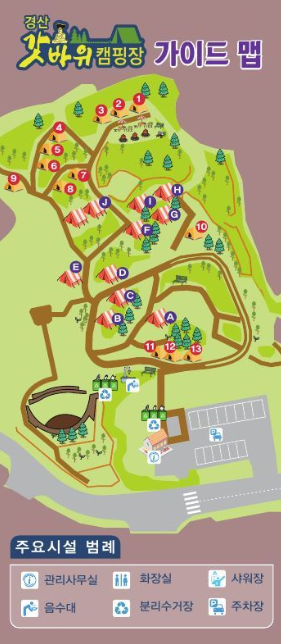 캠핑장은 경북 경산시 와촌면 갓바위로 596에 위치해 있습니다. 대구에서 차로 30분 남짓, 경산 시내에서도 가까워 접근성이 뛰어납니다. 팔공산도립공원 구역 내에 자리해, 캠핑과 함께 팔공산의 명소인 갓바위(관봉석조여래좌상, 보물 제431호)까지 산책로를 따라 걸어갈 수 있습니다. 고속도로에서는 동대구IC, 경산IC, 청통·와촌IC 등에서 진입하면 편리합니다.