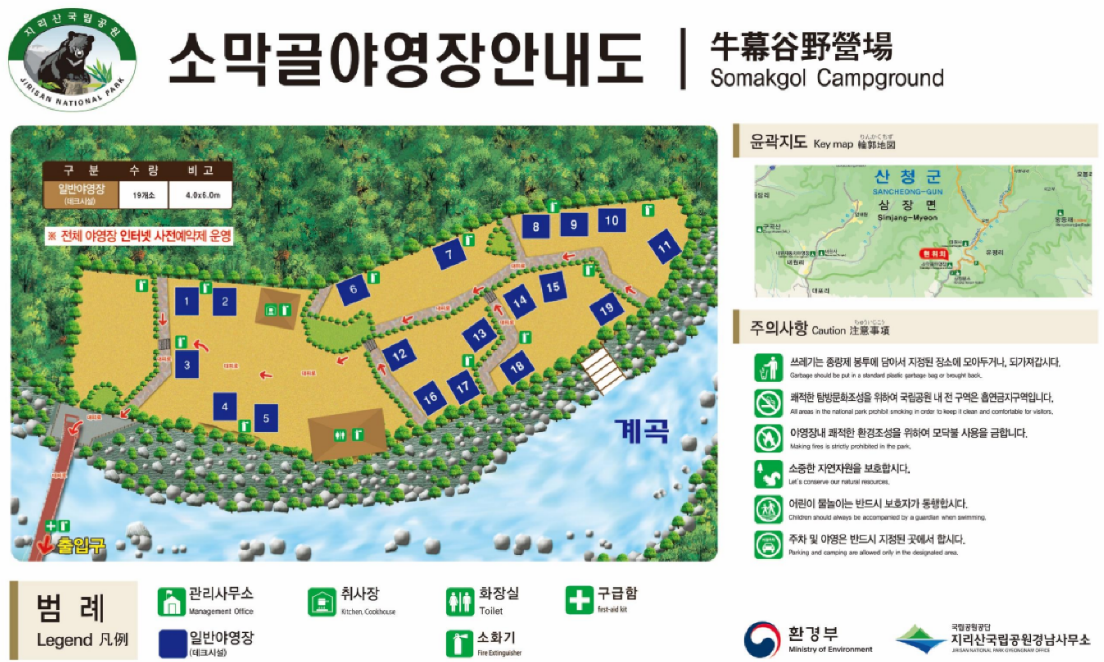 경남 산청군 삼장면 평촌리 산118-1에 위치한 소막골야영장은 지리산국립공원 내에 있어, 자연을 그대로 느낄 수 있습니다. 진입로에 사설 주차장이 마련되어 있는데, 주차 요금은 1박 1만원, 2박 1만5천원으로 별도 지불해야 합니다. 주차장에서 캠핑장까지는 수레를 이용해 짐을 옮겨야 하며, 경사가 살짝 있지만 힘들 정도는 아닙니다. 백패킹이나 짐이 적은 미니멀 캠핑에 특히 잘 어울리는 곳입니다.