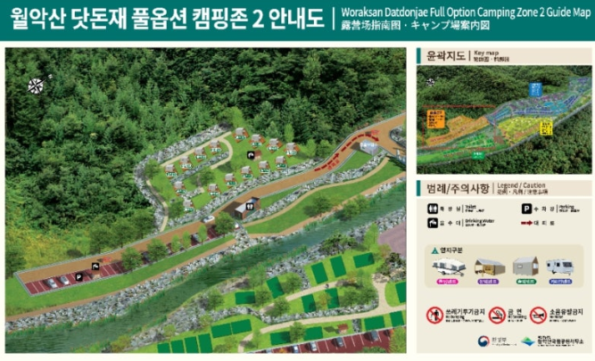 - 오토캠핑존: 총 119면의 자동차 야영장이 마련되어 있다. 사이트 크기는 5m x 7m로 넉넉하다. 바닥은 맨흙이라 자연을 더 가까이 느낄 수 있다.