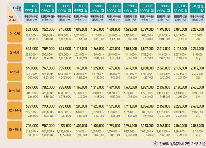 2025년 양육비산정표: 실제 표 예시