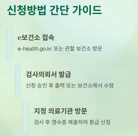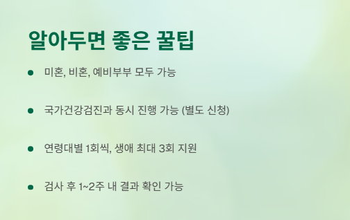 • 국가검진과 병행 가능? – 일부 지정기관에선 건강검진 (예: 국가건강검진) 시 동시 진행, 별도 신청필수