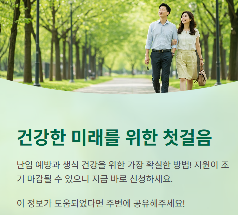 • 비용지원: 여성 최대 13만원, 남성 최대 5만원(실비 차감 형태)
