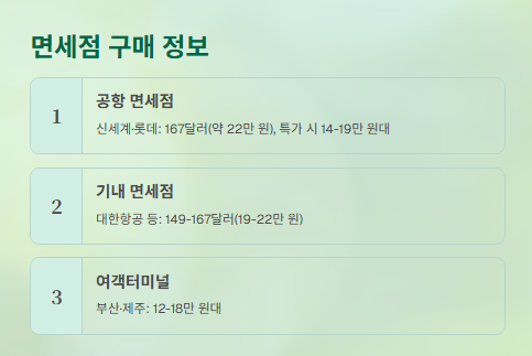 • 기내 면세점(대한항공 등): 149~167달러(19~22만 원 내외)