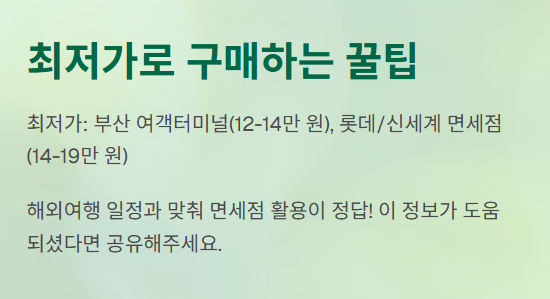 • 최저가: 부산 여객터미널 면세점(약 12만~14만 원대), 롯데/신세계 면세점(14~19만 원대)