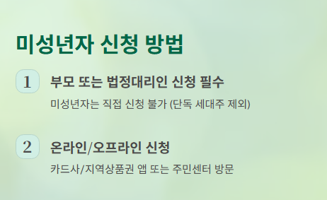 • 온라인: 카드사/지역상품권 앱, 정부지원금 사이트에서 세대주 인증, 자녀 선택 후 지급 수단 지정