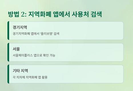 경기지역은 경기지역화폐 앱에서 '올리브영'을 검색하면, 내 주변 사용 가능한 가맹점 목록을 주소와 함께 바로 볼 수 있습니다. 서울은 서울페이플러스에서, 기타 지역도 각 지자체 지역화폐 앱을 활용하면 간편하게 확인 가능! - 올리브영 공식 홈페이지 공지 확인