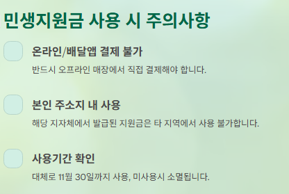 - 사용 전 현장 문의: 확실하지 않을 땐 직원에게 "여기서 민생지원금(쿠폰) 사용할 수 있나요?"라고 물어보세요.