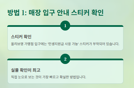 올리브영 가맹점 입구에는 '민생지원금(소비쿠폰) 사용 가능' 스티커 또는 안내문이 반드시 부착되어 있습니다. 실물 확인이 가장 빠르고 확실한 방법입니다. - 지역화폐 앱에서 사용처 검색