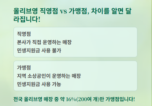 올리브영 매장은 크게 직영점과 가맹점으로 나뉩니다. 이 중 민생지원금(소비쿠폰)은 올리브영 가맹점에서만 사용 가능합니다. 즉, 본사가 직접 운영하는 직영점에서는 지원금 사용이 절대 불가하고, 각 지역의 소상공인이 점주로 운영하는 가맹점에서만 사용이 가능합니다.