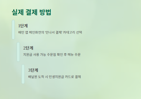 - 주문 전 매장 공지 확인: 배민 앱 내 ‘현장 결제 가능 매장’, 혹은 매장 안내문(민생지원금 사용 가능 스티커 등) 참고.