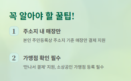 - 사용지역: 본인 주민등록상 주소지 내 소상공인 가맹점만 가능