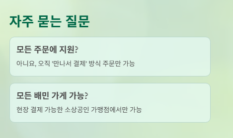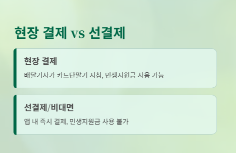 - 현장 결제: 배달기사가 매장 카드단말기를 들고와 집 앞에서 소비자가 직접 실물 카드를 결제 (적립금·지역화폐·민생지원금 카드 모두 지원)