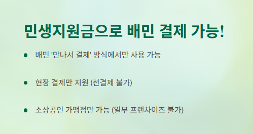- 선결제/비대면 결제: 앱 내에서 즉시 결제(신용카드·페이 등)는 민생지원금 사용 불가