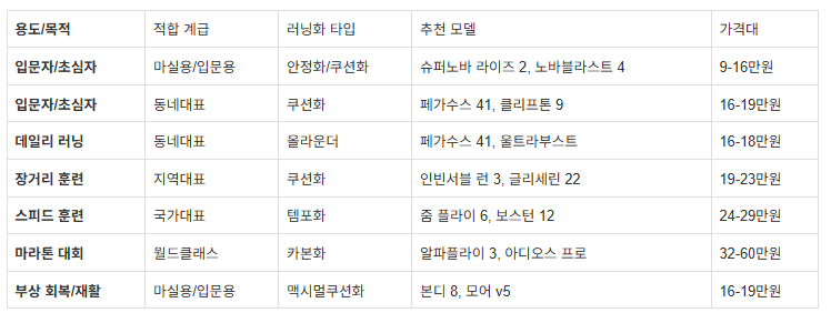 | 용도/목적 | 적합 계급 | 러닝화 타입 | 추천 모델 | 가격대 |