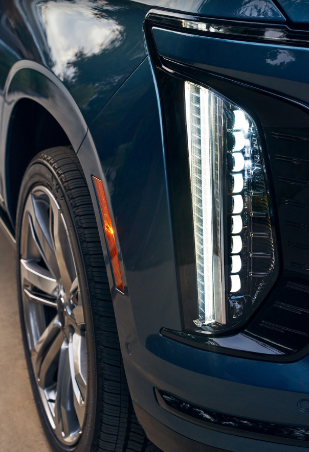 • 전면부: 조명이 들어오는 대형 그릴(캐딜락 엠블럼 일체형)과 슬림한 세로형 LED 헤드램프