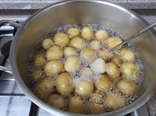 • 끓는 물에 소금을 1/2큰술 넣고 알감자를 10~12분 정도 삶아주세요.