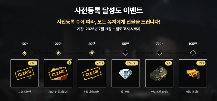 예약자 수 목표 달성 시 고급 아이템, 에픽 조명탄, 캐릭터 등 대규모 보상 지급!