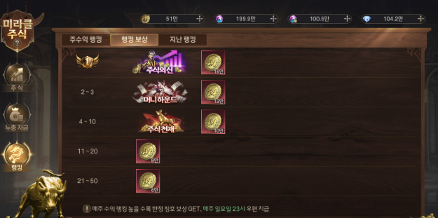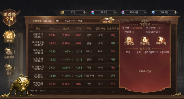 - 게임 자원(골드, 크리스탈 등)으로 계정 내 ‘기적 주식’ 코너 진입 → 원하는 종목 매수/매도