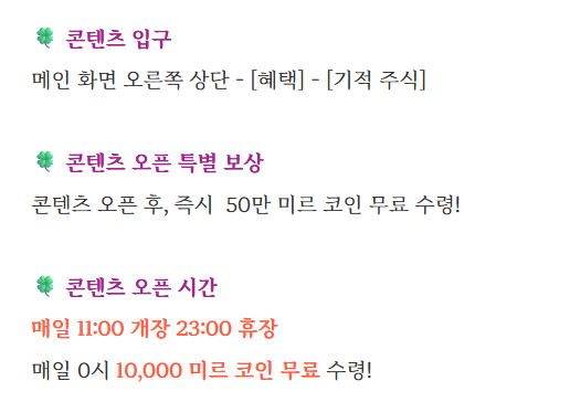 저는 시즌별 미라클 주식 2회 참여로, 무료로 UR 소환권 1장, 기적 코인으로 강화석 8개 교환 등 성장 루틴에 큰 도움을 받았습니다.